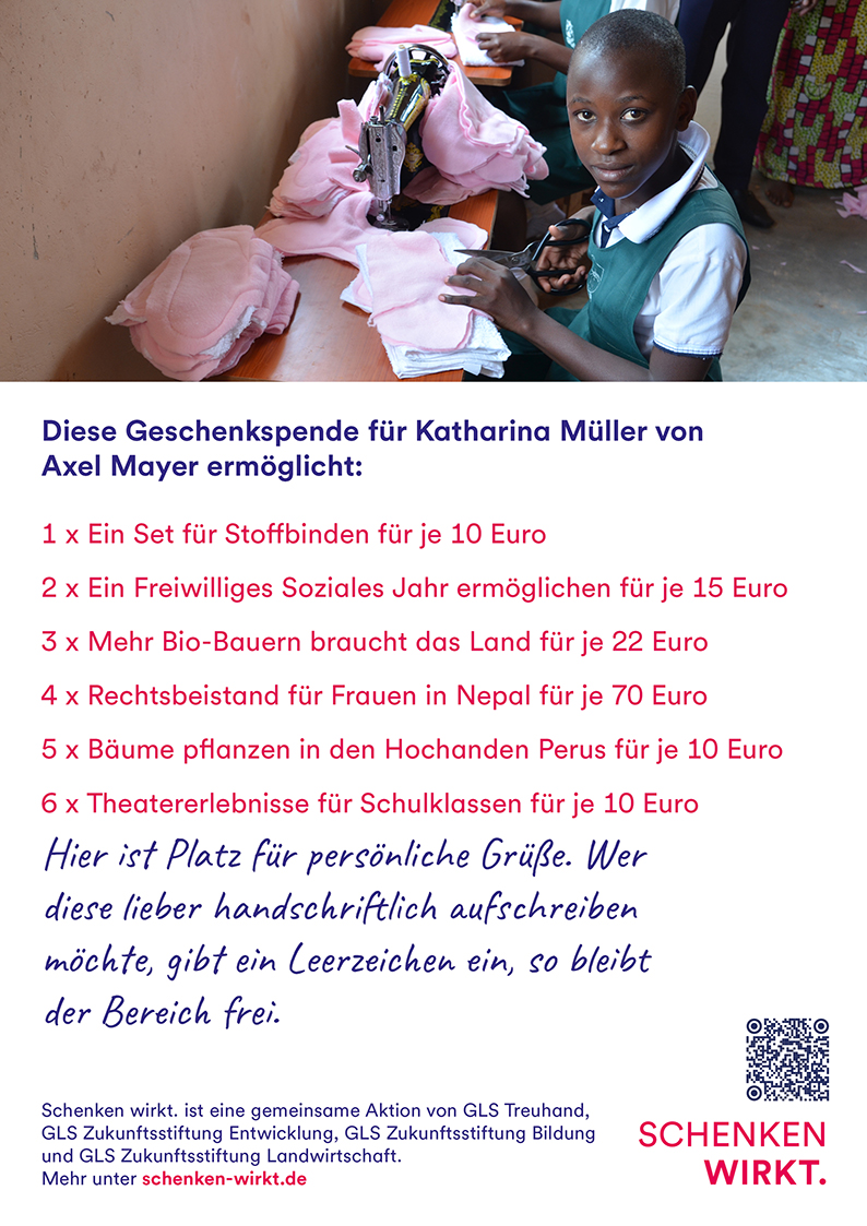 „Schenken wirkt“ ist eine gemeinsame Aktion von GLS Treuhand, GLS Zukunftsstiftung Entwicklung und den Zukunftsstiftungen Bildung und Landwirtschaft.